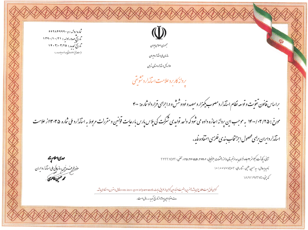 پروانه استاندارد تشویقی اجزا قاب بندی فلزی