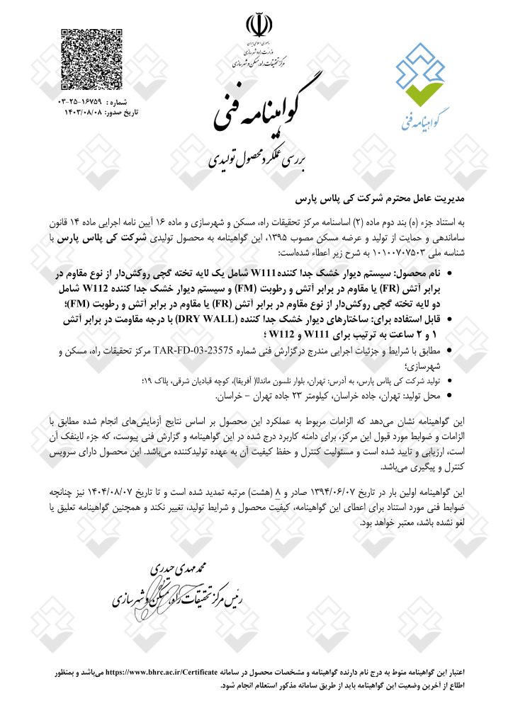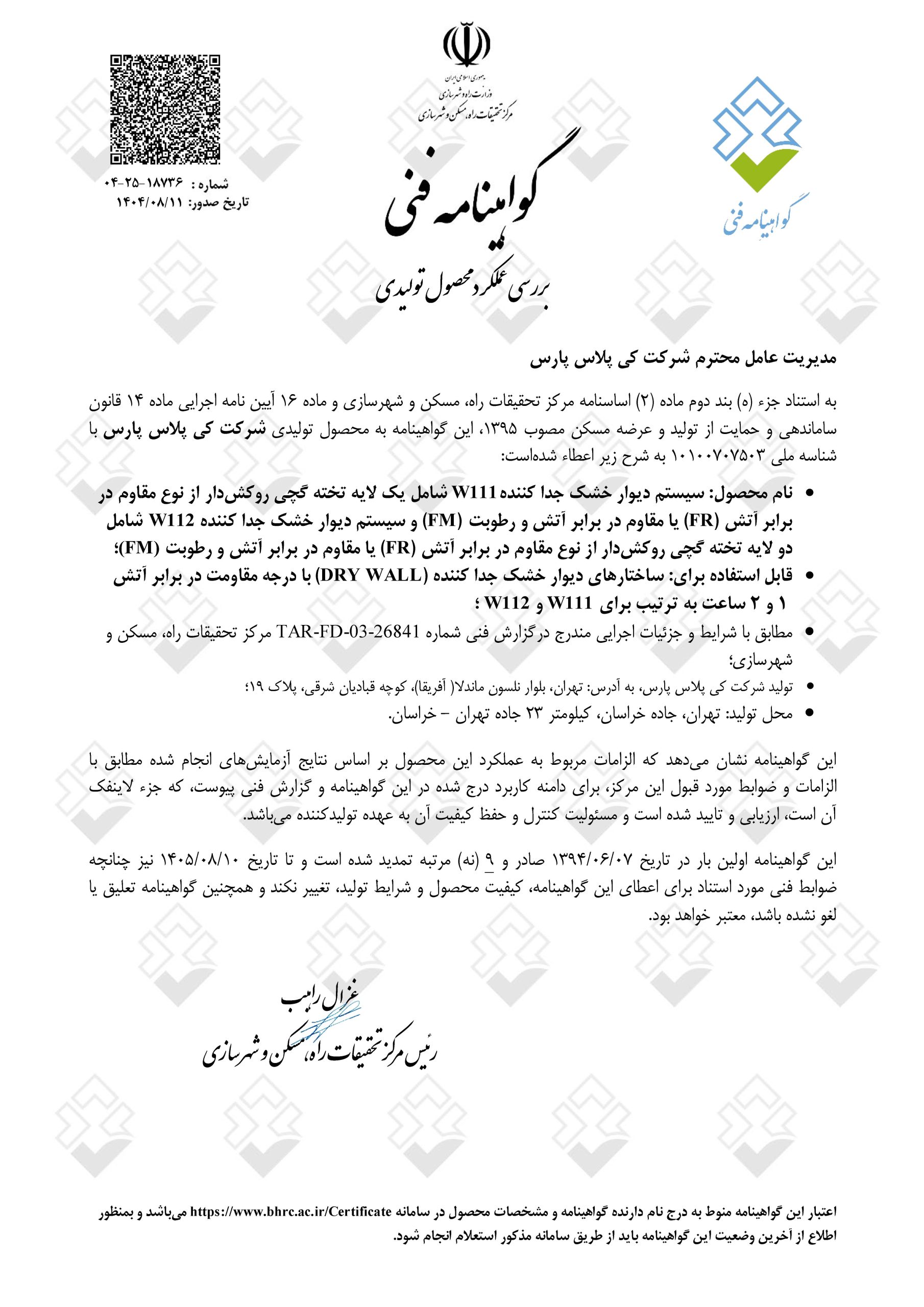 گواهینامه فنی دیوار جداکننده دارای کد حریق